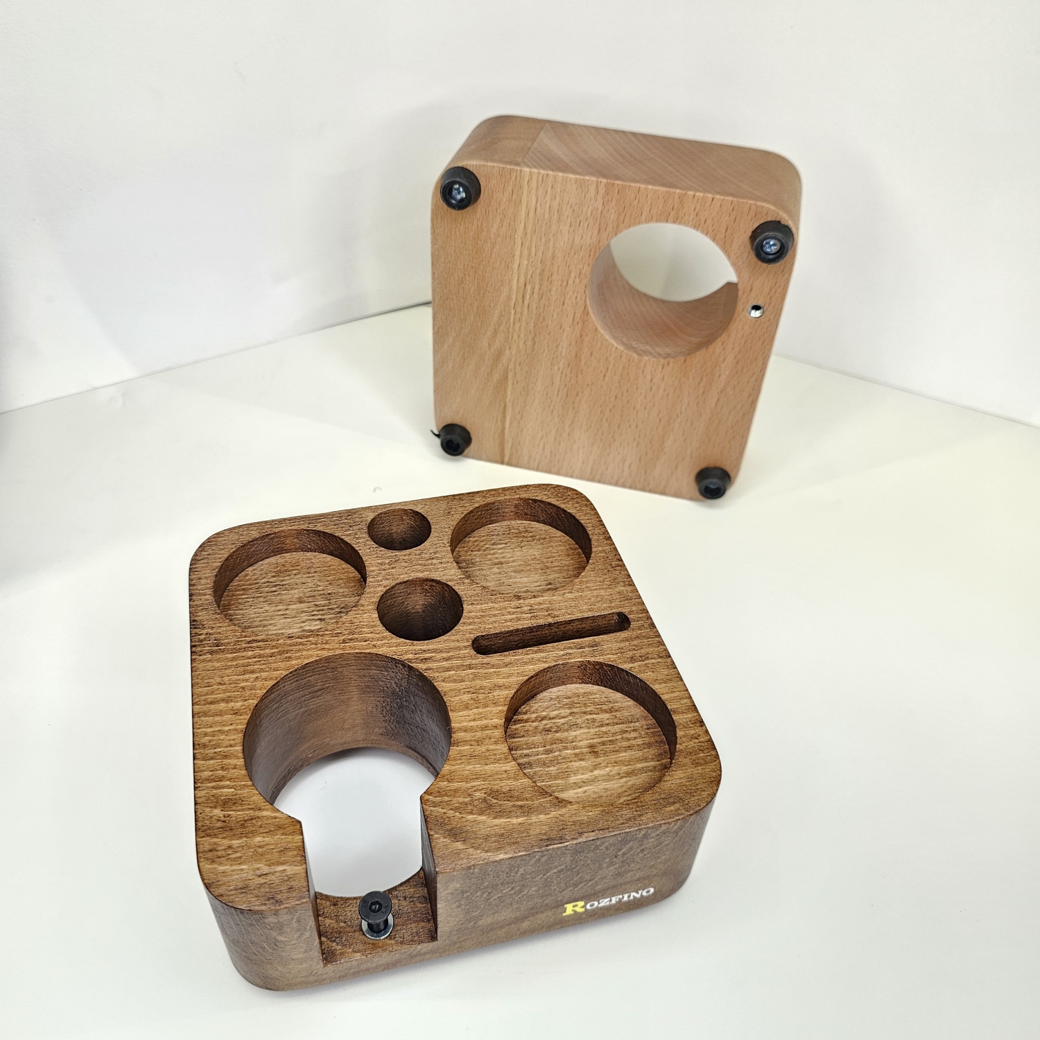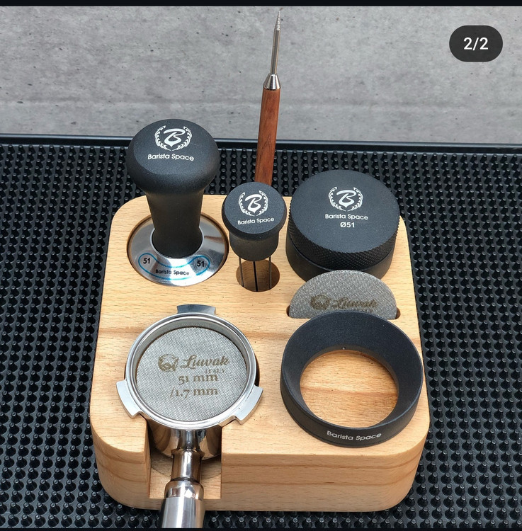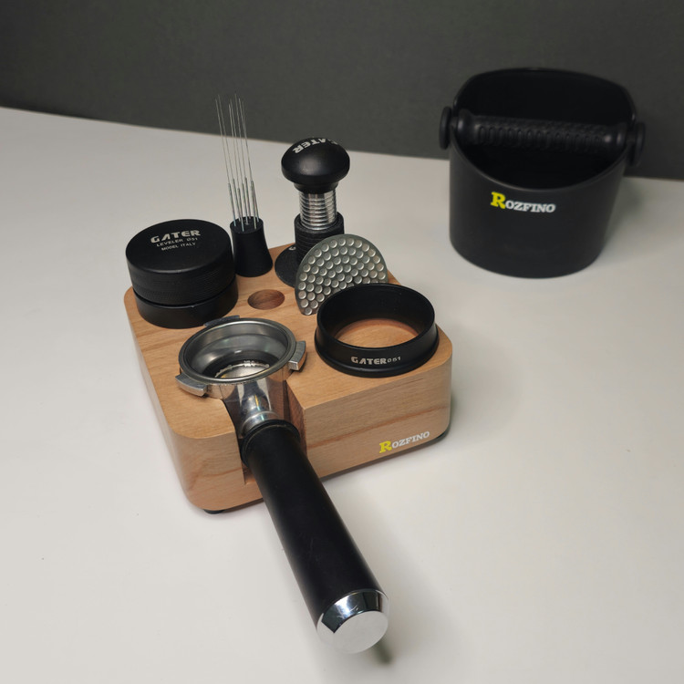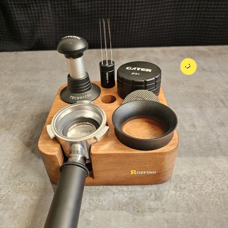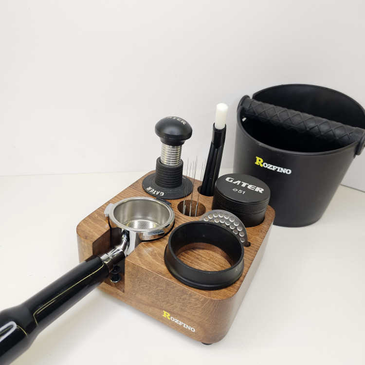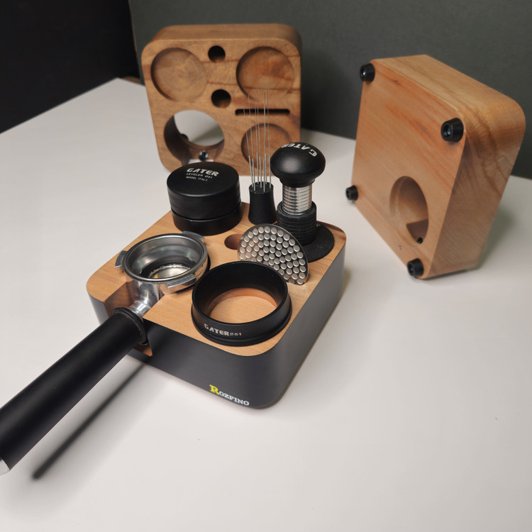 استند چوبی پرتافیلتر نظم دهنده لوازم اسپرسوساز مانند پرتافیلتر، تمپر، لولر، نیدل، پاک اسکرین، قلم آرت، فرچه تمیز کننده دستگاه