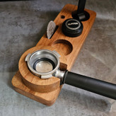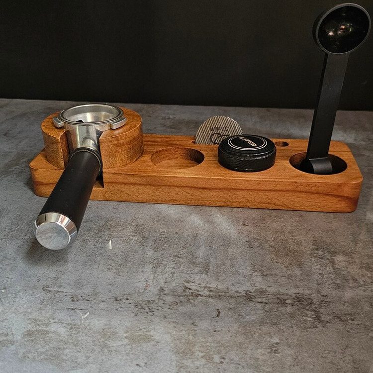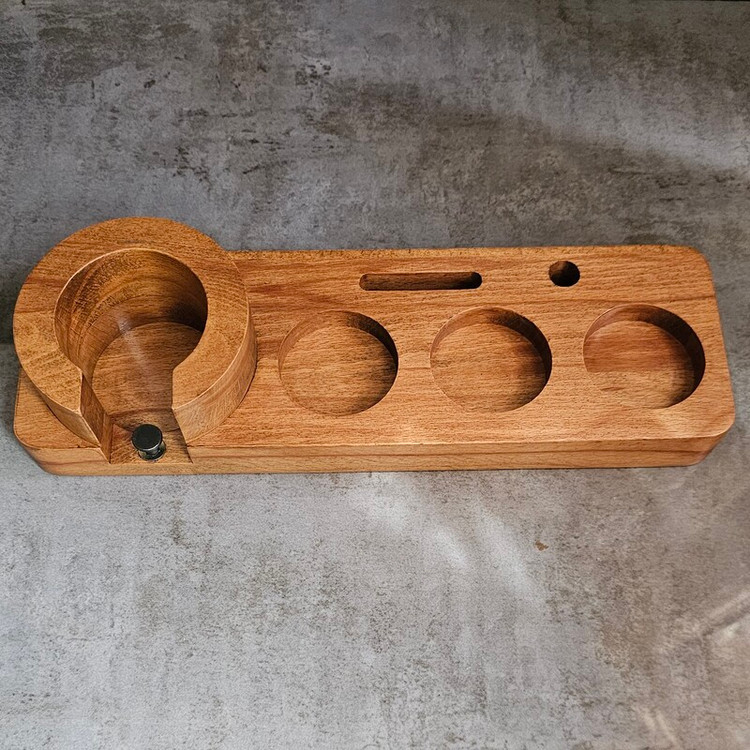 استند پرتافیلتر چوبی سایز 51 تمام لوازم کنار دستگاه اسپرسوساز اعم از پرتافیلتر، نیدل، تمپر، لولر، فانل، پاک اسکرین و قلم آرت رو میتونید روی این استند قرار بدید و به لوازمتون نظم بدید این استند دارای پیچ تنظیم برای قرارگیری پرتافیلتر در بهترین حالت میباشد. با قرار دادن پرتافیلتر روی این استند دیگر براحتی میتوانید قهوه را درون پرتافیلتر ریخته و تمپ کنید.